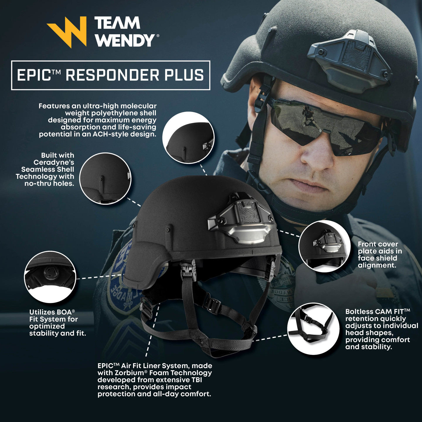 - Features Team Wendy Ceradyne’s seamless ballistic shell technology*